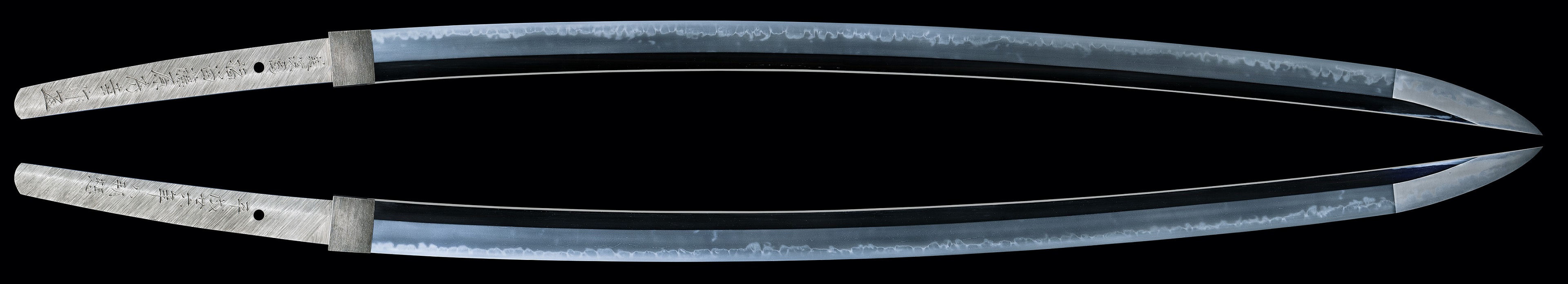 長寸のわきざし。刃長一尺八寸、反り三分強。肌は小板目。波紋は互の目乱れ。為銘部分の個人名は隠してあります。